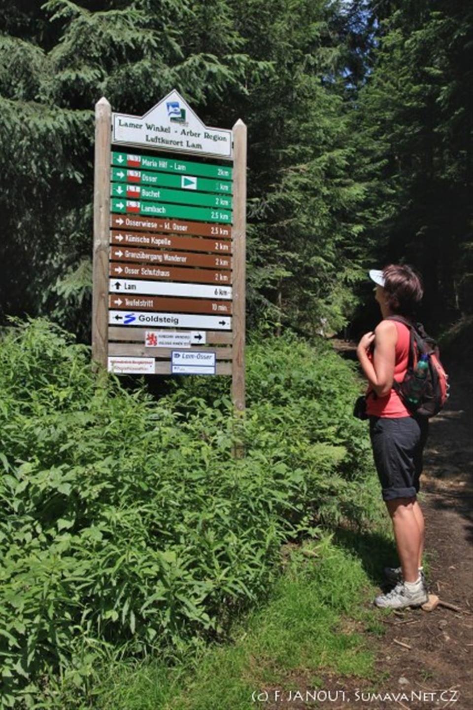 Na výchozím místě Osserwanderparkplatz - Sattel je přístřešek, nástěnná turistická mapa oblasti Lamer Winkel a tabule se směrovkami, podle nichž si lze vybrat různé turistické cíle v okolí. Pro výstup na Velký Ostrý zvolte červenobílou značku L1/3, po níž se dostanete po 2,3 km na vrchol. Po téže značce je možno s odbočením na Malý Ostrý pohodlně zvládnout nejen oba vrcholy, ale také si vychutnat zážitek z impozantní Osserwiese. Trasa se tím prodlouží o pouhých 600 m, takže doporučuji, určitě za to stojí.
